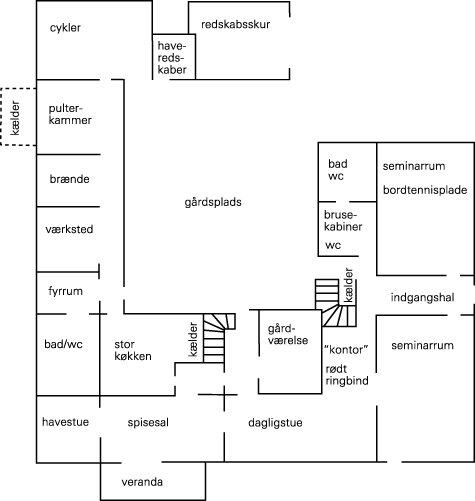 indgangshal “ kontor ” gårdværelse havestue dagligstue seminarrum seminarrum / bordtennisplade spisesal stor køkken bad pulterkammer værksted cykler gårdsplads trappe