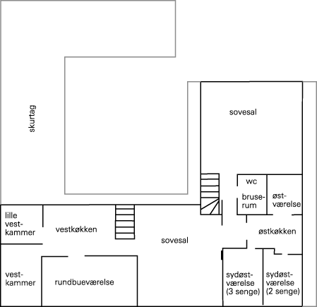 korridor sydøstværelse (2 senge) sydøstværelse (3 senge) østværelse østkøkken sovesal studio ~ rundbueværelse vestkøkken